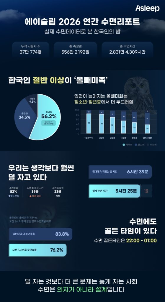 슬립테크 기업 에이슬립이 ‘2026 대한민국 수면 리포트’를 통해 한국인의 심각한 수면 실태를 공개했다. 37만 명의 실제 수면 데이터를 2년간 분석한 결과, 한국인은 침대에 평균 6시간 39분을 머물지만 실제 수면 시간은 권장 시간보다 크게 부족한 5시간 25분에 그쳤다. 수면의 질도 평균 수면 효율 82%로 낮게 나타났다. 특히 전체 성인의 56.2%가 늦게 잠드는 ‘올빼미형’으로 집계됐으며, 평균 입면 시각은 새벽 0시 51분이었다. 이는 전 세계 평균보다 늦은 시각이며, 늦은 취침이 수면 효율 하락으로 이어져 한국 사회의 수면 문제가 생체 리듬이 뒤로 밀린 구조적인 형태로 고착화하고 있다는 분석이다. 에이슬립 이동헌 대표는 수면을 공중보건 관점에서 접근하고 수면 시간뿐 아니라 타이밍 회복의 중요성을 강조했다.