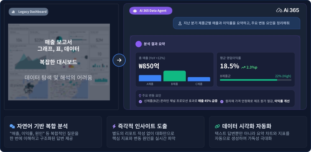 AI 통합 업무 플랫폼 전문기업 엠클라우드브리지(대표 이혁재)가 대화형 분석 에이전트 ‘Ai 365 데이터 에이전트’를 출시하며 차세대 AI+BI 시장 공략을 강화한다. ‘보는 BI’에서 ‘대화하는 AI+BI’로의 시장 변화에 맞춰 개발된 이 솔루션은 기업 데이터에 자연어 분석과 업무 자동화를 결합, 대화형 분석 체계로의 전환을 지원한다. 다양한 데이터 소스를 연결하여 사용자의 자연어 질문에 데이터 조회, 분석, 시각화, 보고서 생성, 자동화된 후속 조치까지 전 과정을 AI 에이전트가 수행하는 것이 특징이다. 엠클라우드브리지는 제조·유통 등 산업 PoC에서 정기 보고서 제작 시간 최소 30% 절감 효과를 입증했으며, 솔루션과 함께 실무형 교육 프로그램을 제공하며 고객사의 AI·데이터 기반 의사결정 역량 강화를 지원할 방침이다.