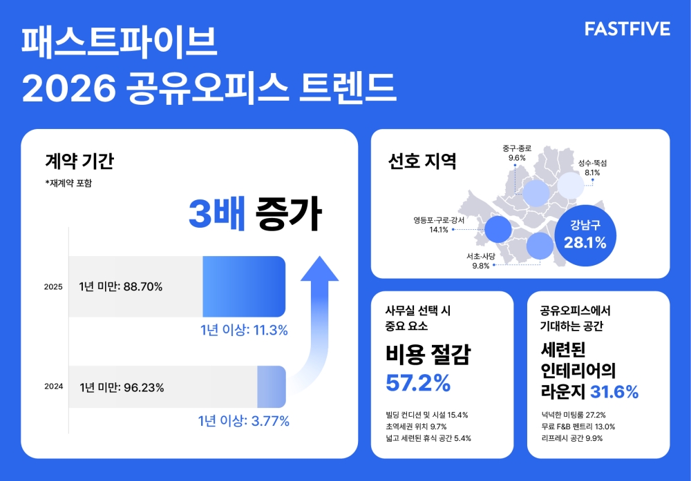국내 대표 오피스 플랫폼 패스트파이브가 2025년 오피스 이용 데이터를 분석한 ‘2026 공유오피스 트렌드’를 공개했다. 분석 결과, 1년 이상 장기 이용 기업 비중이 전년 대비 약 3배 증가하며 공유오피스가 상시 업무 거점으로 확고히 자리매김한 것으로 나타났다. 전체 계약의 평균 계약 기간은 7.37개월이었다. 기업들의 오피스 선택 기준은 비용 절감(57.2%)이 가장 중요했으며, 빌딩 컨디션 및 시설(15%)이 뒤를 이었다. 또한, 라운지와 미팅룸 등 협업 중심의 공용 공간 활용도가 중요한 선택 요소로 부각되었으며, 입지 선호도는 강남(28.1%)이 가장 높았다. 이는 기업들이 유연성과 안정성을 모두 고려하는 방향으로 오피스 전략을 조정하고 있음을 시사한다.