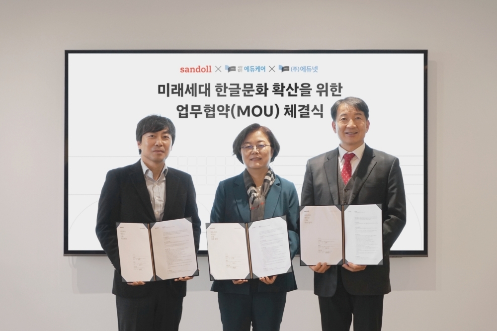폰트 플랫폼 기업 산돌이 (사)에듀케어, ㈜에듀넷과 미래세대 한글 문화 확산 및 교육 콘텐츠 품질 향상을 위한 3자 업무협약을 체결했다. 산돌은 이번 협약에 따라 전국 보육교직원 약 20만 명에게 자사의 폰트 플랫폼 ‘산돌구름’ 서비스를 제공한다. 보육교직원들은 산돌의 유료 및 무료 폰트 약 3,190종을 저작권 걱정 없이 활용해 영유아 교육 콘텐츠를 제작할 수 있게 됐다. 이는 교육 환경 개선과 보육 현장의 폰트 저작권 인식 제고, 한글 가치 확산에 기여할 것으로 기대된다.