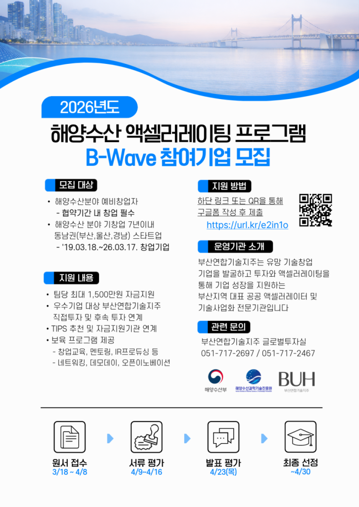 부산연합기술지주가 동남권 해양수산 분야 유망 스타트업을 발굴·지원하기 위한 ‘B-Wave 액셀러레이팅’ 프로그램 참여기업 모집에 들어갔다. 이번 프로그램은 해양수산부와 해양수산과학기술진흥원이 추진하는 2026년 해양수산 액셀러레이터 운영 사업의 일환으로, 부산·울산·경남 지역에 본사 또는 지사를 둔 창업 7년 이내 스타트업과 예비창업자를 대상으로 한다. 서면·발표 평가를 거쳐 약 10개 팀이 최종 선정되며, 선발 기업에는 비즈니스 교육, 맞춤형 멘토링, IR 역량 강화, 투자자 네트워킹, 데모데이 참가 기회 등이 제공된다. 모든 선정 기업은 최대 1,500만 원의 초기자금을 지원받고, 우수 기업은 부산연합기술지주의 직접 투자와 후속 투자, TIPS 연계 등 추가 지원도 가능하다. 프로그램 세부 내용과 신청 방법은 해양수산과학기술진흥원 바다봄 플랫폼과 부산연합기술지주 홈페이지에서 확인할 수 있다.