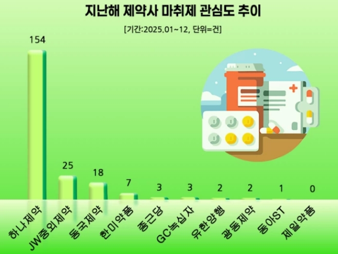 국내 제약업계의 마취제 관심도 조사에서 하나제약이 지난해 압도적인 1위를 차지했다. 데이터앤리서치의 분석에 따르면 하나제약은 마취제 관련 온라인 포스팅 수 154건을 기록, 2위인 JW중외제약(25건)을 크게 앞섰다. 하나제약은 하길 CMO 공장에서 생산한 마취제 신약의 유럽 첫 수출을 기념하는 선적식을 개최하는 등 주목받았으며, 신약 ‘바이파보’의 국내 연간 실적 100억원 전망도 관심도를 높이는 데 기여했다. 전체 마취제 관련 포스팅은 총 215건으로 전년 대비 10.82% 늘어난 것으로 나타났다.