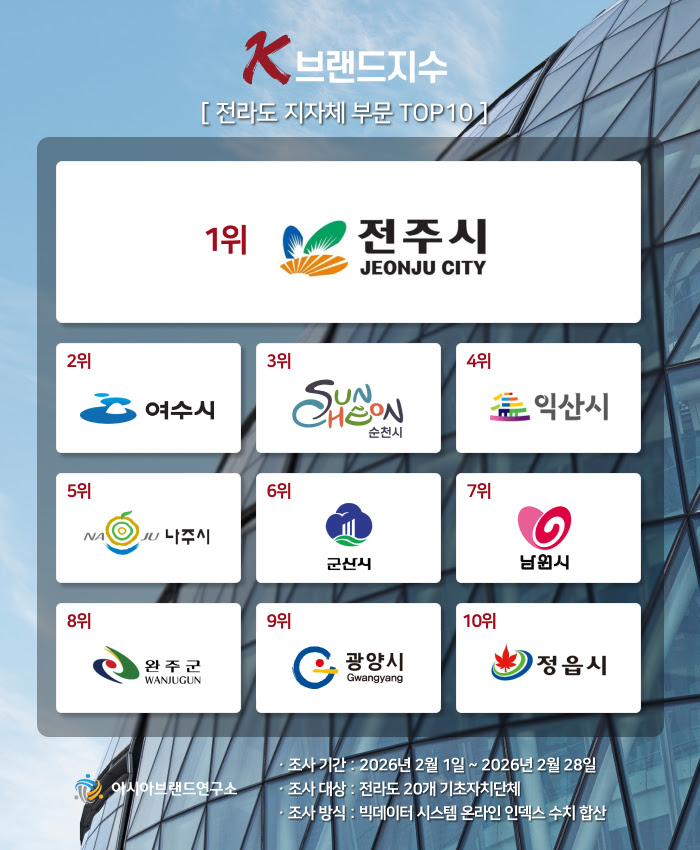아시아브랜드연구소가 발표한 ‘K-브랜드지수’ 전라도 지자체 부문 2월 분석 결과, 전주시가 여수시와 순천시 등 경쟁 지자체를 제치고 영예의 1위를 차지했다. 이번 조사는 전라도 20개 기초자치단체를 대상으로 2월 한 달간 온라인 빅데이터 1354만여 건을 분석해 이루어졌다. 전주시는 가장 한국적인 전통문화와 미식 관광 거점으로서의 독보적인 로컬 브랜딩 가치를 인정받아 선두에 올랐다. 전주시에 이어 해양 관광 거점 여수시가 2위, 생태 수도 순천시가 3위를 기록했으며, 시 단위 경쟁 속에서 도농 복합도시의 성공 모델을 보여준 완주군이 8위에 오르는 약진을 보여 눈길을 끌었다. 이는 전라권 지자체에 대한 대중의 평가 척도가 고유의 문화적 매력도와 특화된 인프라를 중심으로 변화하고 있음을 시사한다.
