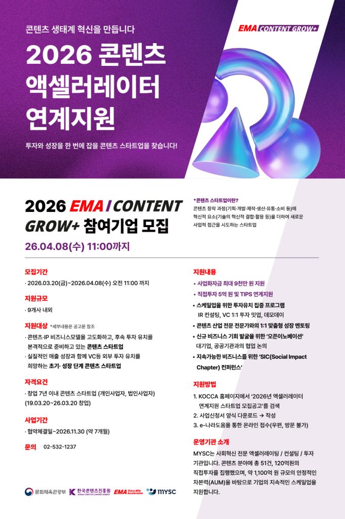 MYSC가 콘텐츠 산업 스타트업의 성장을 지원하는 투자 연계 액셀러레이팅 프로그램 ‘2026 EMA Content GROW+’ 참가 기업을 모집한다. IP와 기술, 데이터를 융합해 새로운 비즈니스 모델을 구축하고 스케일업을 목표하는 창업 7년 이내의 콘텐츠 스타트업이 대상이다. 최종 선발 기업은 최대 9천만 원의 사업화 자금을 지원받으며, 우수 기업에게는 최대 5억 원의 직접 투자 및 TIPS·LIPS 연계 기회가 제공된다. 이 외에도 IR 컨설팅, VC 밋업 등 콘텐츠 기업 맞춤형 액셀러레이팅과 대기업·공공기관과의 협업 기회도 주어진다. 모집 기간은 3월 20일부터 4월 8일 오전 11시까지이며, 3월 27일에는 사업 설명회가 개최된다.