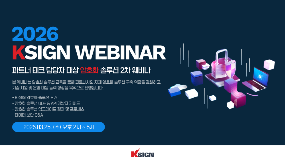 정보보안 전문기업 케이사인(K-sign)이 파트너사 기술 담당자를 대상으로 ‘암호화 솔루션 2차 웨비나’를 25일 개최했다. 이번 웨비나는 단순 이론 학습을 넘어 실제 시스템 구축, 개발, 운영에 필요한 실무 역량 강화에 중점을 두고 마련됐다. 특히 파트너사가 고객 환경에 최적화된 암호화 체계를 직접 설계하고 적용하도록 지원하는 것이 목표다. 교육 프로그램은 비정형 데이터 암호화 솔루션 소개, UDF 및 API 개발자 가이드 등 현업 활용도가 높은 실습 기반 내용으로 구성됐다. 케이사인은 이를 통해 파트너사의 기술 대응 능력이 한층 강화될 것으로 기대하고 있다.