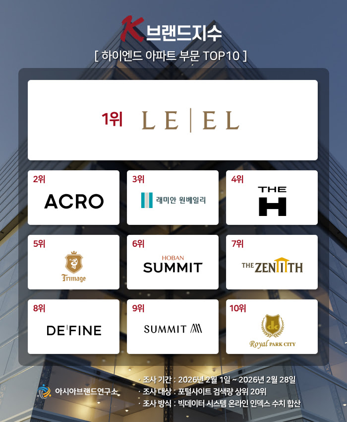 아시아브랜드연구소는 빅데이터 기반 ‘2026년 2월 K-브랜드지수’ 하이엔드 아파트 부문에서 ‘르엘’이 1위를 차지했다고 26일 발표했다. 르엘은 아크로(2위)와 원베일리(3위) 등 주요 브랜드를 제치고 선두에 올랐다. 이 지수는 포털사이트 검색량 상위 20개 단지를 대상으로 지난 2월 한 달간 온라인 빅데이터 219만여 건을 분석해 산출됐다. 연구소는 르엘의 1위 등극은 최고급 마감재와 차별화된 설계 등 상위 1%를 지향하는 주거 철학에 대한 대중의 선호도가 빅데이터로 입증된 결과라고 설명했다. 또한, 주택 시장을 향한 평가 척도가 단순한 입지나 시공 능력을 넘어 거주자의 사회적 지위를 대변하는 ‘하이엔드 라이프스타일’ 중심으로 재편되고 있다고 진단했다.