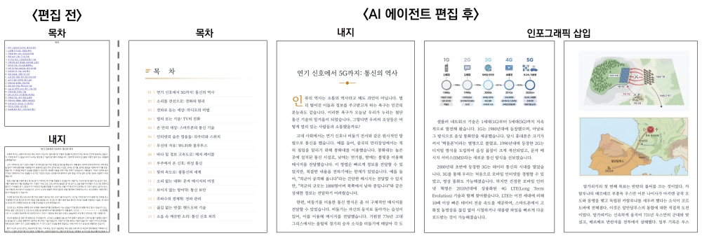 AI 출판 전문 기업 루미너리북스가 원고 입력만으로 도서의 내지 전체를 자동으로 디자인하는 AI 에이전트 기반 시스템을 자체 개발했다고 26일 밝혔다. 표지 디자인을 넘어 원고 구조 분석, 최적화된 페이지 레이아웃과 타이포그래피 적용은 물론, 내용 파악을 기반으로 맥락에 맞는 인포그래픽을 자동으로 생성·삽입하는 것은 국내 최초 사례로 평가된다. 기존 수일에서 수주가 소요되던 편집 과정을 단 3\~5분 만에 완료하는 획기적인 속도를 자랑하며, 4월부터 자사 도서에 적용하고 외부 상용 판매도 적극 검토할 방침이다.