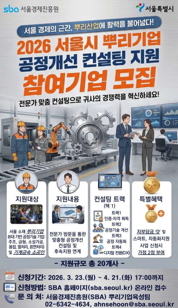 서울시와 서울경제진흥원이 주조·금형·소성가공·용접·열처리·표면처리 등 6대 기반 공정기술 분야의 뿌리기업과 상시근로자 10인 미만 기계금속 소공인 20개사를 대상으로 공정개선 컨설팅을 지원한다. 이번 사업은 숙련 인력 감소, 불량률 증가, 노후 설비 등 제조 현장의 구조적 문제를 해결하기 위해 전문가가 직접 방문해 개선안을 제시하는 방식으로 운영된다. 참여 기업은 인증 취득, 품질·공정기술 고도화, 공정 자동화, 디지털 전환 등 네 가지 트랙 중 하나를 선택해 맞춤형 컨설팅을 받을 수 있다. 컨설팅 완료 기업에는 2028년까지 서울뿌리산업지원허브의 자동화·스마트제조 지원사업 신청 시 가점이 부여되며, 정부 지원사업 정보 제공과 전문기업 매칭 등 후속 지원도 연계된다. 신청은 4월 21일까지 서울경제진흥원 홈페이지에서 온라인 접수로 진행된다. 기관 측은 개선 필요성과 혁신 의지를 갖춘 기업을 우선 선정해 정체기에 놓인 제조기업의 체질 개선과 성장 기반 마련을 돕겠다는 방침이다.