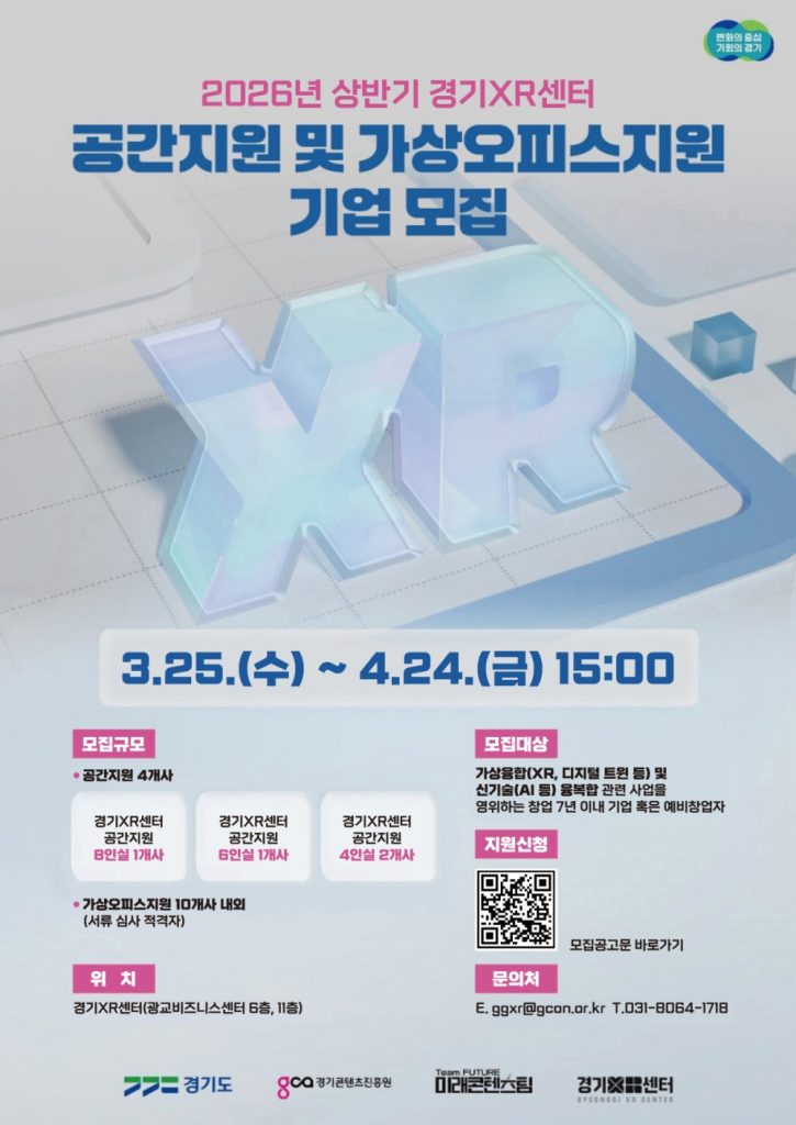 경기콘텐츠진흥원이 2026년 상반기 경기XR센터 입주 및 가상오피스 지원 기업 모집을 시작하며 가상 융합·신기술 분야 스타트업 발굴에 나선다. 경기XR센터는 XR, 디지털 트윈, AI 등 융복합 산업 기반을 확장하기 위한 특화 시설로, 독립 사무공간과 회의실, 라운지, 고사양 장비, 테스트베드 등 인프라를 제공한다. 이번 모집은 단순 공간 제공을 넘어 네트워킹, 전문가 컨설팅 등 성장 단계별 프로그램을 포함해 기업의 실질적 성장을 지원하는 데 중점을 둔다. 입주 형태는 독립 사무실을 제공하는 공간지원과 주소지 제공을 중심으로 한 가상오피스지원으로 나뉜다. 공간지원은 총 4개 기업을 선정하며, 가상오피스는 서류 심사를 통해 적격 기업을 선발한다. 대상은 설립 7년 이내의 XR·신기술 융복합 분야 스타트업 또는 예비 창업자로, 기본 입주 기간은 1년이며 평가를 통해 최대 2년까지 연장 가능하다. 경콘진은 이번 모집을 통해 기술·콘텐츠 융합 분야의 성장 잠재력을 지닌 기업을 육성하고 지역 산업 생태계 확장을 도모한다는 계획이다. 신청은 경콘진 누리집에서 확인 후 4월 24일 오후 3시까지 이메일로 접수한다.