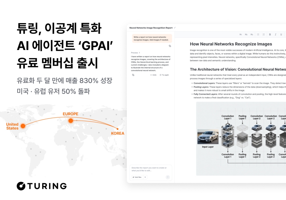 추론 AI 에이전트 개발사 튜링의 이공계 특화 서비스 ‘GPAI’가 유료 멤버십 출시 두 달 만에 매출 830% 이상의 폭발적인 성장을 기록했다. 전체 구독자의 50%가 미국과 유럽 등 해외에서 유입되며 글로벌 시장 공략에 성공했다는 평가다. 유료 구독자의 대다수는 석·박사, 연구원 등 이공계 전문 인력으로 나타났으며, 글로벌 기업 R\&D 부서 및 대학 연구소와의 B2B 계약 역시 증가 추세다. 튜링은 자체 개발한 추론 최적화 기술과 시각화 엔진을 통해 환각(할루시네이션) 현상을 극복하고 전문가 수준의 답변을 제공, 이공계 워크플로우 혁신을 주도하고 있다. 튜링은 연내 의료 및 통계 분야로 GPAI의 적용 범위를 확장하며 글로벌 매출 50억 원 이상 달성을 목표하고 있다.