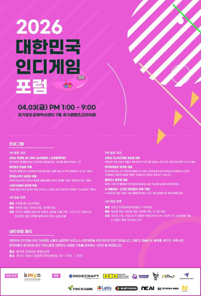 한국모바일게임협회는 오는 4월 3일 경기콘텐츠코리아랩에서 ‘2026 대한민국 인디게임포럼’을 개최하고 인디게임 생태계의 현황을 점검하고 지속 가능한 성장 방향을 논의한다. 창작과 비즈니스, 커뮤니티 간의 교류를 위해 기획된 이번 포럼은 ‘NC AI’와 ‘플레이나누’가 후원한다. 포럼은 두 개의 세션과 네트워킹 시간으로 구성된다. 1부 세션에서는 부산인디커넥트페스티벌 심사위원장의 오프닝 스피치를 시작으로, 인디게임 <산나비> 회고록, 꿈을 만드는 과정에서 겪은 선택들, 그리고 인디게임 설계 노트 등 세 가지 주제의 강연이 진행된다. 이어 NC AI의 스페셜 발표와 연사들과 함께하는 패널 토론이 이어진다. 2부 세션은 성공적인 스팀 게임 개발팀의 유형을 주제로 한 오프닝 강연 후, AI 시대의 프로토타이핑을 통한 게임성 검증, 게임사의 생애주기 파트너로서의 역할, AI-Native 게임 사례와 기술 흐름 등 세 가지 강연이 이어진다. 이후 플레이나누 대표의 특별 강연과 패널 토론을 끝으로 세션이 마무리되며, 참석자들은 네트워킹 시간을 통해 정보 교류를 이어갈 예정이다. 협회는 이번 포럼이 중소게임산업과 인디게임 생태계 도약의 계기가 되기를 바라며, 향후 글로벌 진출, 서브컬쳐, IP 융합 등 주요 산업 이슈를 다루는 주제별 컨퍼런스를 확대할 계획이다. 또한, 기존의 AI 및 인디게임 컨퍼런스를 통합해 2026년 말에는 게임산업의 방향성과 미래 비전을 조망하는 통합 컨퍼런스를 추진할 예정이다.