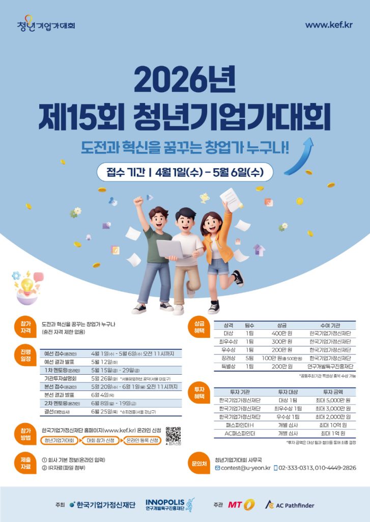 한국기업가정신재단이 주최하고 머니투데이 및 AC패스파인더가 공동 주관하는 ‘2026년 제15회 청년기업가대회’가 참가자를 모집한다. 4월 1일부터 5월 6일 오전 11시까지 한국기업가정신재단 홈페이지를 통해 온라인으로 신청할 수 있으며, 도전과 혁신을 꿈꾸는 창업가라면 누구나 참여 가능하다. 2011년부터 시작된 이 대회는 크몽, 스타일쉐어, VCNC 등 유니콘 기업을 배출한 국내 대표 창업경진대회로, 유망 스타트업 발굴 및 지원을 목표로 한다. 선정 절차는 예선 접수, 1차 멘토링, 기관투자설명회, 본선 접수, 2차 멘토링을 거쳐 6월 25일 결선(대면)으로 마무리된다. 최종 수상팀에게는 대상 400만 원 등 총 1500만 원의 상금과 더불어, 한국기업가정신재단으로부터 대상 팀 최대 5000만 원을 포함한 투자 혜택이 제공된다. 또한, 공동 주관사인 패스파인더H와 AC패스파인더는 대회 수상과 별개로 개별 심사를 통해 각각 최대 10억 원과 1억 원의 투자를 검토할 계획이다. 본선 및 결선 진출팀에게는 VC/AC 멘토링과 미디어 홍보 지원, 후속 투자 연계 등 초기 성장에 필요한 다양한 지원이 함께 제공될 예정이다.