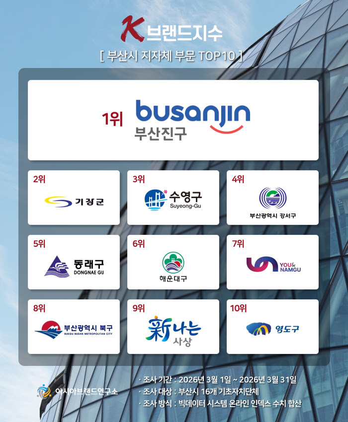 아시아브랜드연구소는 2026년 3월 부산시 지자체 부문 K-브랜드지수 분석 결과를 3일 발표했다. 1위는 부산진구가 차지하며 선두를 지켰고, 기장군이 2위에 올랐다. 특히 수영구가 단숨에 3위로 급상승하며 눈길을 끈 반면, 부산의 대표 랜드마크 지역인 해운대구는 6위로 하락했다. 이와 함께 남구, 북구, 사상구, 영도구 등 4개 자치구가 새롭게 톱10에 진입하며 지자체 브랜드 경쟁력 판도 변화가 두드러진 것으로 나타났다. 연구소 측은 부산진구가 도심 재생과 시민 소통 행정으로 신뢰도를 높였으며, 향후 ‘실생활 체감형 밀착 정책’ 등이 경쟁력의 핵심이 될 것이라고 분석했다.