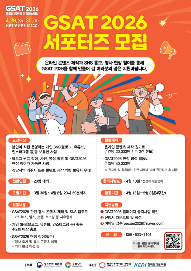 경상남도가 글로벌 융복합 창업페스티벌 ‘GSAT 2026’의 열기를 국내외에 전할 서포터즈를 모집한다. GSAT은 과학·예술·기술을 결합한 창업 중심 축제로, 도는 온라인 홍보 역량을 갖춘 시민 참여단을 구성해 행사 분위기를 확산할 계획이다. 서포터즈는 4월 13일부터 5월 8일까지 4주간 활동하며 카드뉴스·릴스·숏폼 등 온라인 콘텐츠 제작과 행사 현장 취재 미션을 수행한다. 주 2회 이상 콘텐츠를 제작해야 하며, 활동에 따른 원고료와 현장 참여 활동비가 지급된다. 모집 인원은 20명 내외로, 개인 SNS를 운영하는 누구나 지원할 수 있다. 특히 경남 거주자와 콘텐츠 제작 경험자는 우대해 지역 기반 홍보 효과를 높일 방침이다. 지원은 GSAT 2026 누리집에서 신청서를 내려받아 4월 8일까지 이메일로 제출하면 되며, 최종 합격자는 4월 10일 개별 통보된다. 도는 서포터즈가 GSAT의 혁신적 창업 생태계를 널리 알리는 핵심 역할을 할 것으로 기대하고 있다.
