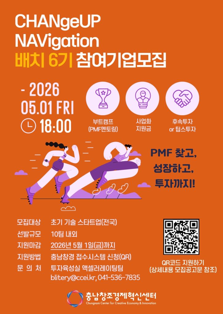 충남창조경제혁신센터가 혁신 기술 기반 스타트업의 성장을 지원하는 ‘2026 CHANGeUP NAVIgation’ 배치 6기 참가기업 모집에 들어갔다. 올해 프로그램은 초기 기업이 가장 큰 난관으로 꼽는 제품-시장 적합성(PMF) 검증에 초점을 맞추고, 선정된 기업이 6개월간 시장 반응을 기반으로 최소기능제품(MVP)을 고도화하고 비즈니스 모델을 조정할 수 있도록 설계됐다. 이번 기수는 약 10개사를 선발해 7월부터 12월까지 집중 지원한다. 각 기업에는 전문 분야에 맞춘 전담 멘토가 1:1로 배정돼 실무 중심의 전략 수립과 실행을 돕는다. 또한 2개월 단위 성과 점검을 통해 사업 진행 상황을 객관적으로 진단받고, 동료 창업자들과의 네트워킹을 통해 시장 인사이트를 공유하는 구조가 마련됐다. 프로그램 종료 후 우수 기업에는 센터의 직접 투자 검토와 함께 기술창업 지원 프로그램인 TIPS 추천 등 후속 지원이 제공된다. 충남혁신센터는 이번 배치를 통해 지역을 넘어 글로벌 경쟁력을 갖춘 스타트업을 육성하겠다는 목표를 제시했다. 접수는 5월 1일 오후 7시까지 온라인 신청 페이지를 통해 진행된다.