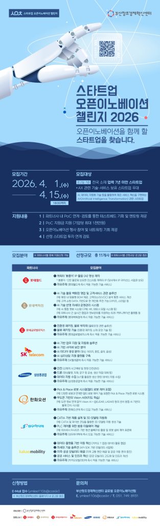 부산창조경제혁신센터가 대·중견기업과의 공동 혁신을 목표로 한 ‘스타트업 오픈이노베이션 챌린지 2026’ 참가 스타트업을 15일까지 모집한다. 이 프로그램은 대기업이 필요로 하는 기술·서비스를 보유한 초기 기업을 발굴해 협업 기회를 제공하는 방식으로 운영되며, 2020년 시작 이후 7회째를 맞았다. 올해는 롯데월드, 롯데백화점, 롯데글로벌로지스, 삼성중공업, 카카오모빌리티, 성우하이텍, SK텔레콤, 한화오션 등 8개 기업이 참여해 총 11개 스타트업을 선발한다. 모집 분야는 AI 기반 영상 제작, 백화점 운영 솔루션, 친환경 물류 패키징, 드론·데이터 자동화, 모빌리티 혁신, 3D 모델링 자동화, AI 보안·미디어 생성, 로봇 시스템 등으로 구성된다. 이 외에도 즉시 기술 적용이 가능한 전국 7년 미만 스타트업이면 지원할 수 있다. 선정 기업은 각 대·중견기업의 현업팀과 함께 기술 검증을 진행하고, 온·오프라인 현장에서 PoC(사업 실증) 기회를 제공받는다. 기업당 최대 1천만 원의 실증 지원금과 함께 투자 유치를 위한 피칭 무대, 오픈이노베이션 행사 참여 기회도 주어진다. 부산창경은 산업계·투자사 연계, 멘토링 등 다양한 지원 인프라를 통해 스타트업의 성장을 돕는다는 계획이다. 신청은 4월 15일까지 가능하며, 서류 및 발표평가를 거쳐 최종 선정된다. 부산창경은 올해 신규 파트너사 참여로 협업 가능성이 더욱 확대될 것으로 기대하며, 유망 스타트업의 적극적인 참여를 독려하고 있다.