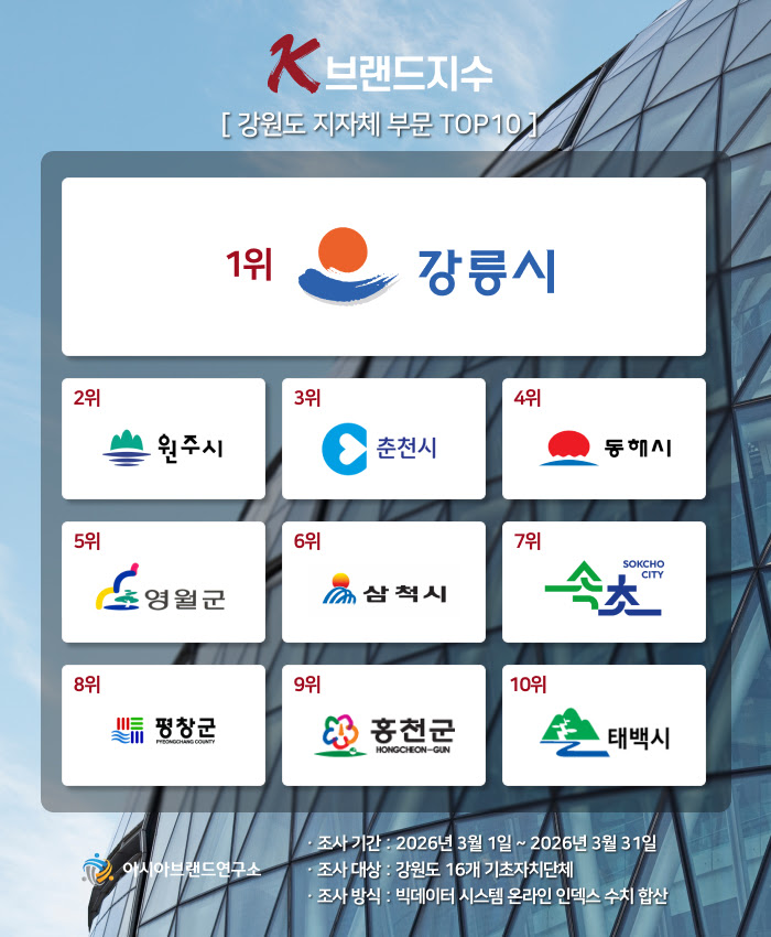 아시아브랜드연구소는 6일 ‘K-브랜드지수’ 강원도 지자체 부문에서 강릉시가 1위를 차지했다고 발표했다. 이는 3월 1일부터 31일까지 강원도 16개 기초자치단체를 대상으로 662만여 건의 온라인 빅데이터를 분석한 결과다. 강릉시는 고유한 문화 관광 자원과 시민 소통 행정의 경쟁력이 종합적으로 반영되어 대한민국 대표 관광 거점도시로서의 굳건한 브랜드 가치를 입증했다. 특히 원주시가 한 단계 상승한 2위에 오르며 꾸준한 상승세를 보였고, 영월군이 역사 도시로 새롭게 자리매김하며 TOP10에 진입했다. 이는 대중의 평가 기준이 단순 인지도를 넘어 ‘지역 맞춤형 인프라’와 ‘지속 가능한 발전 가능성’으로 변화하고 있음을 보여준다.