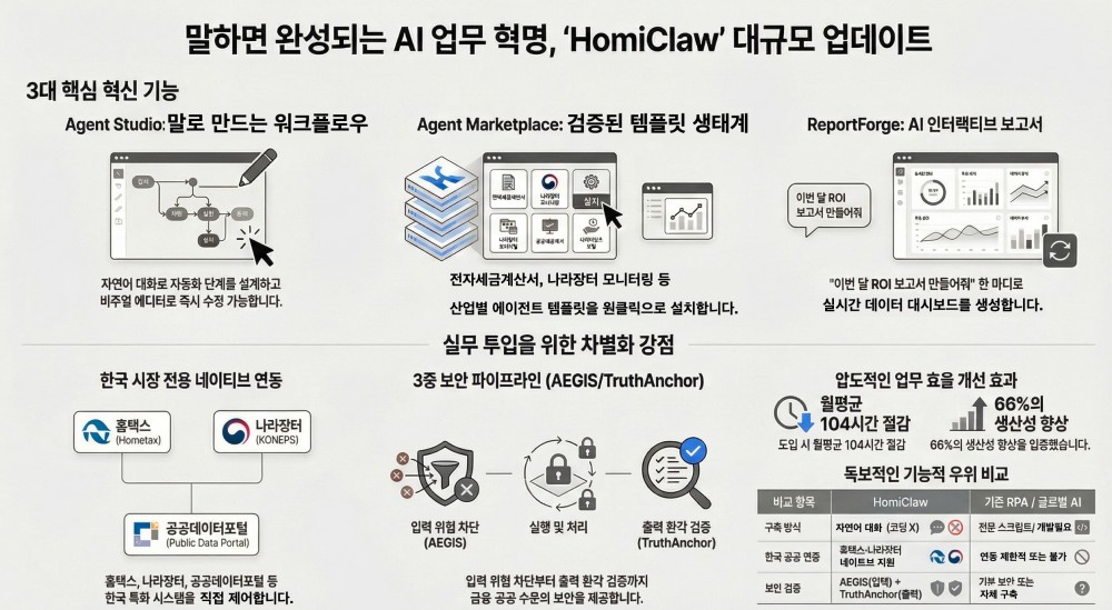 AI 업무 자동화 플랫폼 ‘HomiClaw’를 운영하는 야타브가 대규모 기능 업그레이드를 공개했다. 이번 개편은 자연어 기반 자동화 설계 도구인 Agent Studio, 검증된 자동화 템플릿을 유통하는 Agent Marketplace, 자동화 성과를 시각화하는 ReportForge 등 세 가지 핵심 기능을 중심으로 이뤄졌다. HomiClaw는 반복 업무를 AI 에이전트가 대신 수행하도록 설계된 플랫폼으로, 직무 분석부터 실행·보안·거버넌스까지 단일 파이프라인으로 통합한 것이 특징이다. 특히 홈택스, 나라장터, 공공데이터포털 등 한국 기업이 실제 사용하는 시스템과의 네이티브 연동, 한국어 기반 보안 우회 공격 탐지 기능 등 국내 시장 특화 요소가 강화됐다. 야타브는 이번 업데이트를 시작으로 결제 시스템 연동, 원클릭 클라우드 배포, Windows·Linux 양대 OS 지원, 엔터프라이즈 SSO 통합 등 추가 확장을 2026년까지 순차적으로 추진할 계획이다. 보안과 안정성도 대폭 보강해 입력·실행·출력 전 구간을 보호하는 3중 보안 구조를 적용했으며, 금융·공공·방산 등 고신뢰 산업에서도 활용 가능한 수준의 안전성을 확보했다. 회사 측은 자연어 기반 자동화 설계, 한국 시장 전용 기능, 생태계 기반 확장성, 자동화 성과 보고 기능 등을 차별화 요소로 제시하며 기업용 AI 자동화 표준을 구축하겠다는 목표를 밝혔다.