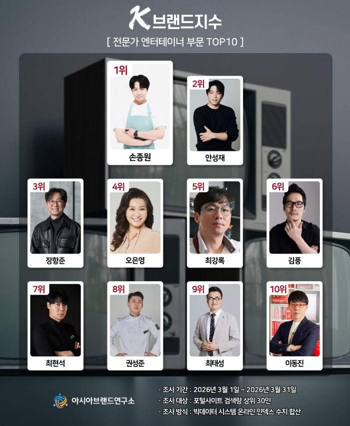 빅데이터 평가 기관인 아시아브랜드연구소는 ‘K-브랜드지수’ 전문가 엔터테이너 부문 1위에 손종원이 선정됐다고 7일 발표했다. 이번 조사는 2026년 3월 1일부터 31일까지 포털사이트 검색량 상위 30인을 대상으로 온라인 빅데이터 약 3억 900만 건을 분석한 결과다. 손종원은 최근 폭넓은 활동으로 압도적인 존재감을 입증하며 1위를 차지했으며, 안성재(2위)와 장항준(3위)이 그 뒤를 이었다. 연구소 측은 전문 지식을 겸비한 엔터테이너의 방송계 진출 트렌드를 반영한 결과라며, 대중의 시선이 단순한 예능적 흥미를 넘어 철저한 실력과 장인 정신을 갖춘 ‘진짜 전문가’에게 쏠리고 있다고 평가했다. 특히 셰프 군단 등 외식 업계 전문가들이 차트에서 강세를 보인 가운데, 장항준, 오은영, 최태성, 이동진 등 지식 기반 분야 전문가들의 약진도 두드러진 현상으로 꼽혔다.