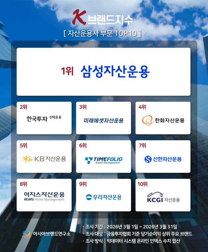 아시아브랜드연구소가 2026년 3월 자산운용사 부문 K-브랜드지수 평가 결과를 발표했다. 3월 한 달간 온라인 빅데이터 222만여 건을 분석한 결과, 삼성자산운용이 운용 전문성과 탄탄한 자본력을 바탕으로 1위를 수성했다. 한국투자신탁운용은 2위에 오르며 삼성자산운용과 함께 강력한 양강 구도를 형성했다. 아시아브랜드연구소 측은 상장지수펀드(ETF) 시장 성장에 힘입어 국내 자산운용사들이 사상 최대 실적을 기록하고 있으며, 대중의 신뢰 척도가 단순 외형적 규모를 넘어 투자자 맞춤형 상품과 포트폴리오 관리 역량을 중심으로 변화하고 있다는 점을 이번 지표를 통해 확인할 수 있다고 진단했다.