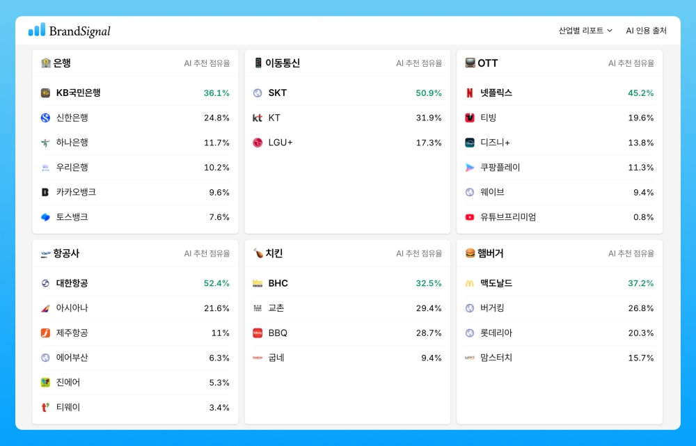 디지털 에이전시 스튜디오파티클이 AI 시대의 브랜드 자산 진단을 위한 ‘브랜드시그널’ 서비스를 선보였다. 이 서비스는 ChatGPT, Gemini, Perplexity, Google AIO 등 주요 AI 엔진 4개가 특정 브랜드를 추천하는 현황을 매주 조사하고 비교 분석한다. 기존 검색 대신 AI를 통해 브랜드에 접근하는 소비자가 늘어나는 가운데, 기업이 AI 인식 현황을 6개 차원(인지, 현저성, 연상, 품질, 선호, 경쟁)으로 분석해 경쟁 우위를 파악하도록 돕는다. 현재 40여 개 산업, 200여 개 브랜드에 대한 분석 리포트를 무료로 제공하며, 박용덕 대표는 AI가 브랜드를 처음 소개하는 순간부터 자사 정보 관리가 중요하다고 조언했다.