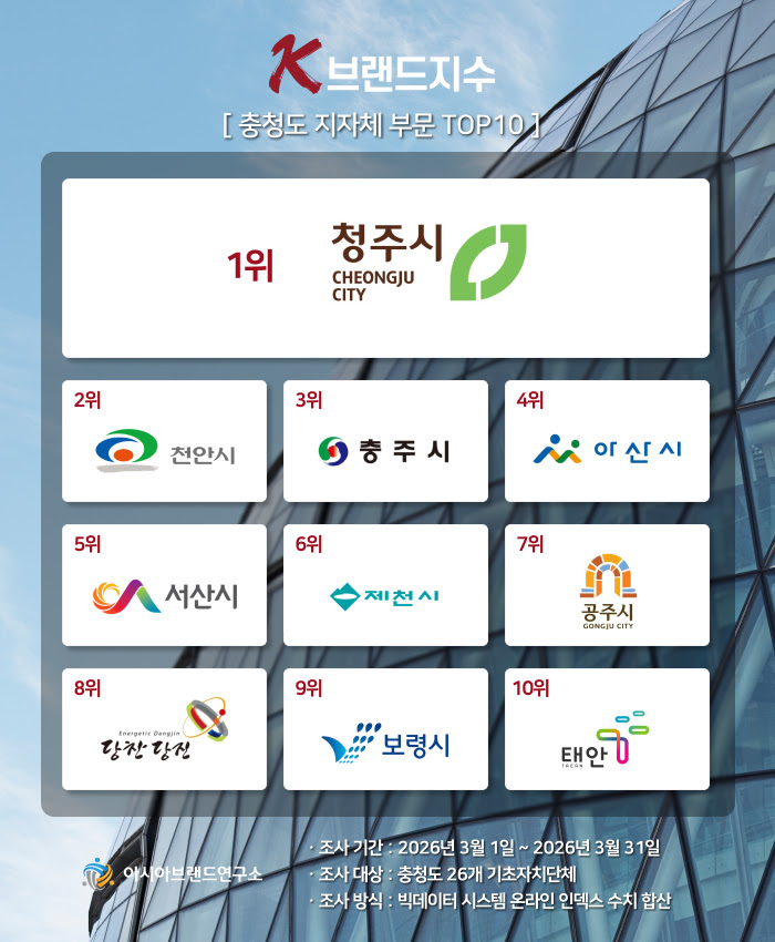 빅데이터 평가 기관인 아시아브랜드연구소는 ‘K-브랜드지수’ 충청도 지자체 부문에서 청주시가 1위에 선정되었다고 9일 발표했다. 이번 평가는 2026년 3월 한 달간 충청도 26개 기초자치단체를 대상으로 1500만 건 이상의 온라인 빅데이터를 분석한 결과다. 아시아브랜드연구소 한정근 대표는 청주시의 이번 성과가 인구 85만을 아우르는 통합 도시로서의 안정적인 행정력과 생활 인프라 확충에 대한 대중의 높은 신뢰를 반영한 결과로 해석했다. 특히 정주 여건과 맞춤형 행정 서비스가 핵심 평가 키워드로 부상한 가운데, 청주시는 천안시(2위), 충주시(3위) 등 주요 도시들을 제치고 정상에 올랐다.