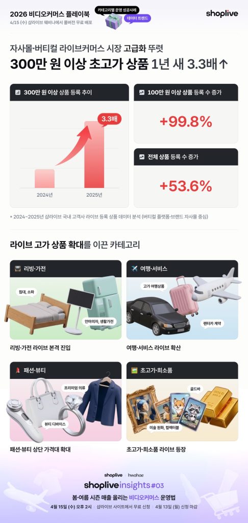 글로벌 비디오커머스 솔루션 기업 샵라이브가 9일 주요 버티컬 플랫폼 및 브랜드 자사몰 라이브 운영 데이터를 분석한 결과를 선공개했다. 네이버·카카오 등 대형 포털이 아닌 독립형 라이브커머스 시장에서 고단가 프리미엄 상품을 중심으로 질적 성장이 뚜렷하게 확인됐다. 2025년 기준 300만 원 이상 초고가 상품 등록 수는 전년 대비 3.3배 증가했으며, 100만 원 이상 고가 상품 비중 역시 역대 최고 수준으로 올라섰다. 이는 리빙, 여행, 장기렌터카 등 설명과 신뢰가 중요한 고관여 상품군이 라이브 판매 채널로 본격 진입하며 시장 성장을 견인하는 구조로 재편되고 있음을 시사한다.