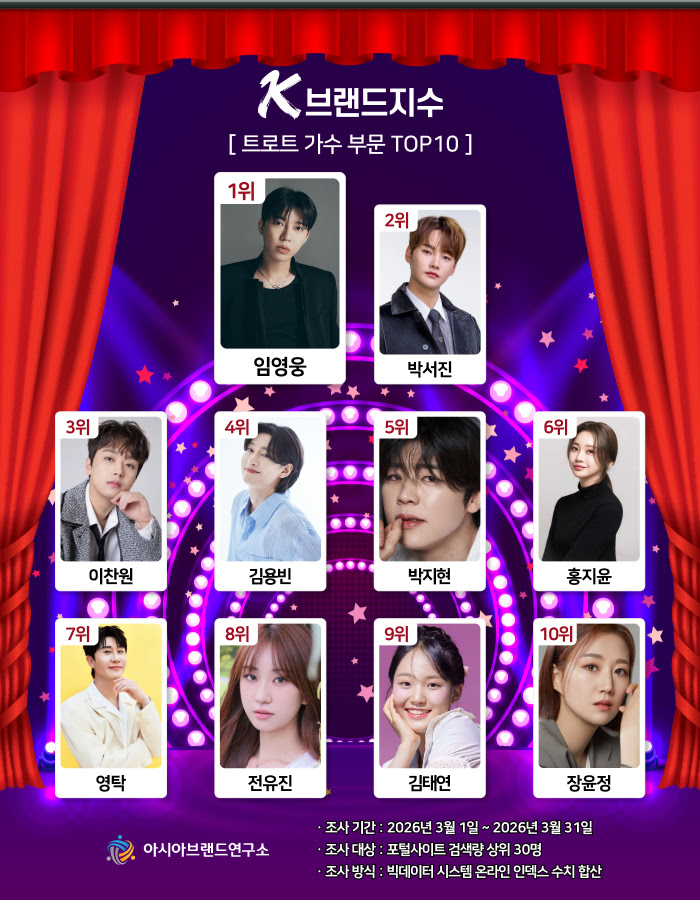 아시아브랜드연구소는 2026년 3월 ‘K-브랜드지수’ 트로트 가수 부문 분석 결과를 10일 발표했다. 이번 조사는 3월 한 달간 포털사이트 검색량 상위 30명을 대상으로 온라인 빅데이터 약 6억 4천만 건을 분석했으며, 팬덤 투표 기반의 ‘스타덤 인덱스’를 공식 반영해 신뢰도를 높였다. 분석 결과, 임영웅이 세대를 아우르는 압도적인 인지도와 긍정적 미디어 평가를 바탕으로 1위 자리를 굳건히 지켰다. 2위는 박서진, 3위는 이찬원이 차지했으며, 박지현(5위)이 새롭게 TOP10에 진입했다. 10대 트로트 스타 김태연(9위)의 톱10 진입은 트로트 시장의 세대교체 흐름과 다변화된 대중 선호도가 브랜드 밸류 상승으로 이어지고 있음을 보여주는 유의미한 지표로 평가됐다.