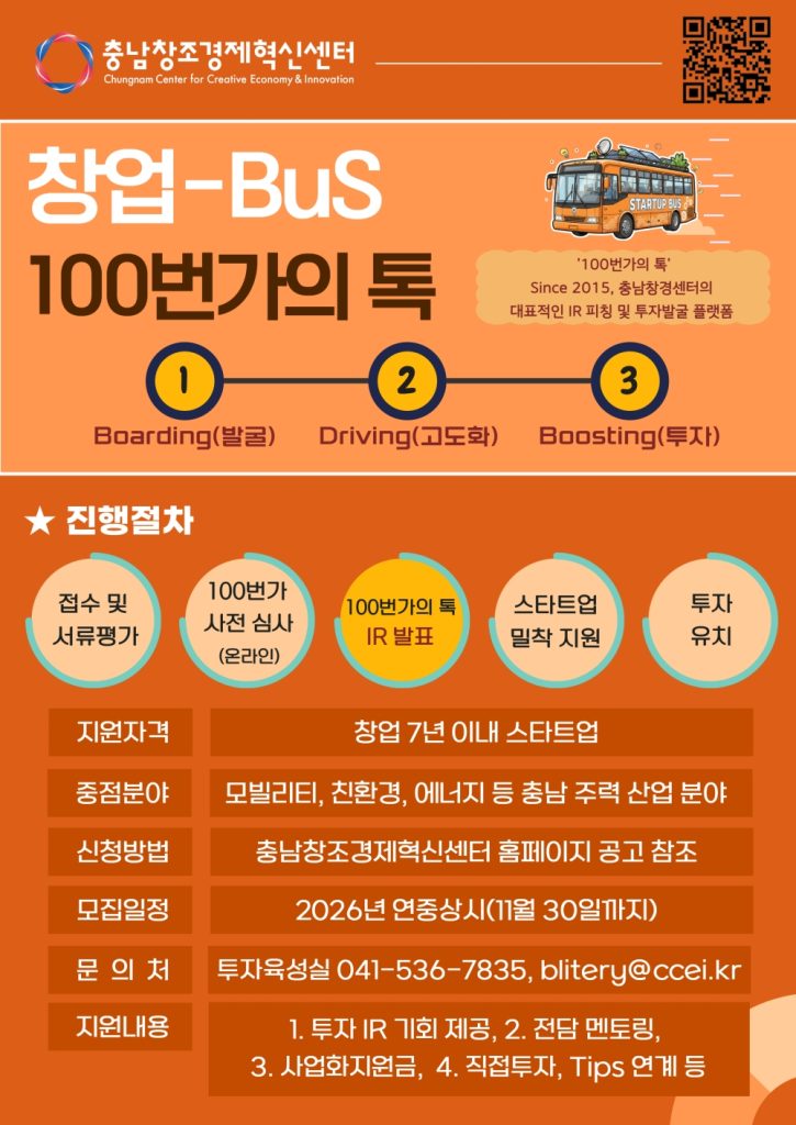 충남창조경제혁신센터가 유망 스타트업을 조기 발굴하고 투자 연계를 강화하기 위한 ‘2026 창업 BuS(Build-up Strategy for Startups)’ 프로그램을 본격 가동한다. 이 프로그램은 초기 기업의 시장 검증과 스케일업을 목표로 상시 피칭, 전문가 멘토링, 액셀러레이팅, 투자 연계 등 단계별 지원 체계를 갖춘 것이 특징이다. 인공지능·바이오·친환경 기술 등 딥테크 분야는 기술성 검증과 사업화 전략 고도화에 집중해 성장 주기가 긴 기업의 특성을 반영한 맞춤형 지원이 제공된다. 일반 창업 분야 역시 비즈니스 모델 개선, 판로 개척, 투자 역량 강화 등 전반적인 성장을 돕는 지원을 받을 수 있다. 모집 대상은 창업 7년 이내 스타트업으로, 선정 기업에는 IR 기회, 전문가 네트워크 연계, 투자 검토 등 다양한 혜택이 제공된다. 충남혁신센터는 이번 프로그램을 전국 혁신센터와 연계해 지역 제한 없는 개방형 창업 지원 모델로 운영하며, 스타트업의 전국·글로벌 확장을 뒷받침할 계획이다.