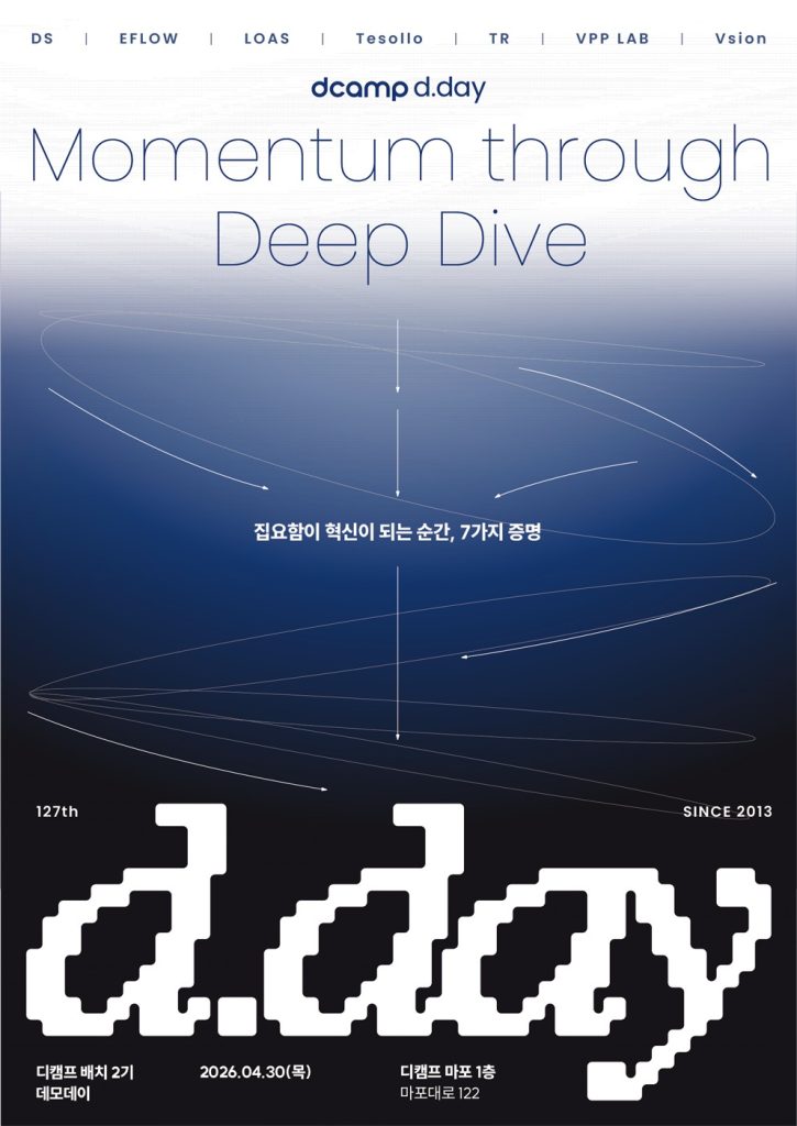 스타트업 성장 파트너 디캠프(은행권청년창업재단)가 오는 30일 디캠프 마포에서 배치 2기 ‘디데이(d.day)’를 개최한다. ‘딥 다이브(Deep Dive)’를 콘셉트로 내세운 이번 행사는 딥테크 및 소부장 분야 정예 스타트업 7개사의 성과를 조명한다. 특히, 기술 난도가 높은 분야임에도 불구하고 지난해 3월 선발된 배치 2기 전원이 12개월간 디캠프의 밀착 지원을 통해 시장 안착과 기술 고도화 목표를 달성했다는 점에서 주목받고 있다. 디에스, 이플로우, 로아스, 테솔로, 티알, 브이피피랩, 뷰전 등 7개 기업은 이번 무대에서 집요한 연구개발(R\&D) 성과가 비즈니스 가치로 전환된 과정을 공개하고, 구체적인 비즈니스 협업 모델도 발표할 예정이다. 현장에서는 스타트업 성과를 직접 확인하는 ‘이노베이션 쇼케이스’와 업계 관계자 교류를 위한 ‘오픈 네트워킹’ 등 부대행사도 마련된다.