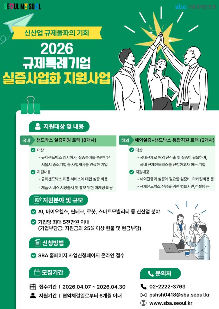 서울시와 서울경제진흥원이 규제샌드박스 활용을 준비하거나 승인받은 중소기업을 대상으로 ‘2026 규제특례기업 실증사업화 지원사업’ 참여기업을 4월 30일까지 모집한다. 이번 사업은 신산업 분야 기업이 제품·서비스 실증 데이터를 확보하고 국내외 실증 기회를 넓힐 수 있도록 지원 체계를 강화한 것이 특징이다. AI, 바이오헬스, 핀테크, 로봇, 스마트모빌리티 등 규제혁신이 요구되는 분야가 우선 선정 대상이며, 기업당 최대 5천만 원 규모의 지원이 제공된다. 올해는 해외 실증을 별도 트랙으로 신설해 국내 규제로 사업화가 지연된 기업이 해외에서 먼저 실증 레퍼런스를 확보한 뒤 국내 규제샌드박스 승인으로 이어질 수 있도록 돕는다. 국내 실증 트랙은 8개사, 해외 실증 및 규제샌드박스 통합지원 트랙은 2개사를 선정할 예정이다. 사업 공고와 신청 서식은 서울경제진흥원 홈페이지에서 확인할 수 있다.