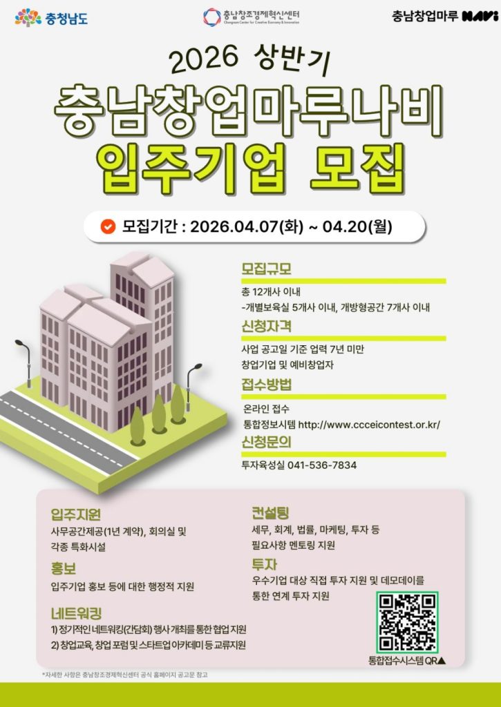 충남창조경제혁신센터가 2026년 상반기 충남창업마루나비에 입주할 스타트업을 오는 20일까지 모집한다. 이번 프로그램은 초기 기업의 성장 잠재력을 발굴하고, 체계적인 지원을 통해 지역 창업 생태계를 강화하는 데 목적을 두고 있다. 지원 대상은 공고일 기준 업력 7년 미만의 창업기업 또는 예비창업자로, 지역 제한 없이 누구나 신청할 수 있으며 약 12개 팀이 선발될 예정이다. 선정 기업은 전용 사무공간과 특화시설, 전국 스타트업 라운지 이용, 홍보·행정지원, 스튜디오·팹랩 장비, 전담 멘토링, 투자 연계, 네트워킹 등 다양한 혜택을 제공받는다. 입주 기간은 1년이며 평가를 통해 최대 3년까지 연장 가능하다. 접수는 4월 20일 오후 2시까지이며, 세부 내용은 센터 공식 홈페이지와 통합접수시스템에서 확인할 수 있다. 센터는 유망 스타트업의 안정적 시장 진입을 돕기 위해 실질적 지원을 강화하겠다는 입장이다.