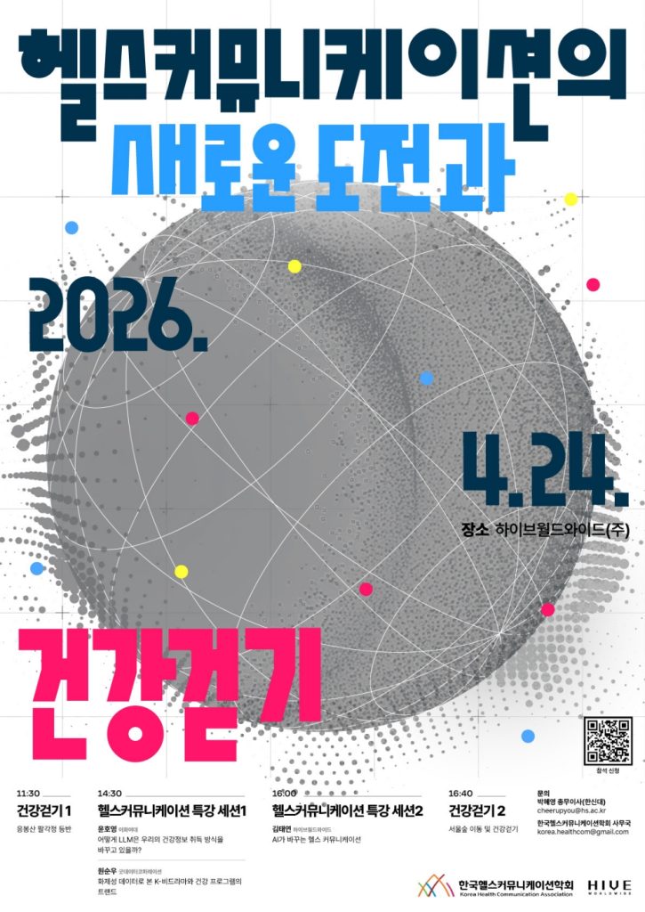 한국헬스커뮤니케이션학회(회장 김활빈)가 오는 4월 24일 하이브월드와이드에서 ‘AI 시대의 건강소통과 실천’을 주제로 2026년 제2차 세미나를 개최한다. 이번 세미나는 생성형 AI 확산과 데이터 환경 변화 속에서 헬스커뮤니케이션의 역할을 재정립하고, 이론을 넘어선 일상 속 건강 실천 방안을 구체화하는 데 중점을 뒀다. 주요 세션에서는 이화여대 윤호영 교수와 굿데이터코퍼레이션 원순우 대표가 각각 거대언어모델(LLM)이 건강정보 취득 방식에 미치는 변화와 데이터 기반 건강 프로그램 트렌드를 분석한다. 또한, 하이브월드와이드 김태연 대표는 AI 기술이 헬스케어 PR 및 마케팅 인프라에 가져온 혁신과 새로운 비즈니스 모델을 제시할 예정이다. 학술 논의와 더불어 참가자들이 서울숲 일대에서 ‘건강 걷기’를 직접 체험하는 현장 참여형 프로그램도 병행되어, 이론과 실천을 결합한 차별화된 접근을 선보인다. 김활빈 회장은 이번 행사가 변화하는 기술 환경에 발맞춘 실질적인 소통 전략을 고민하는 기회가 될 것이라고 전했다.