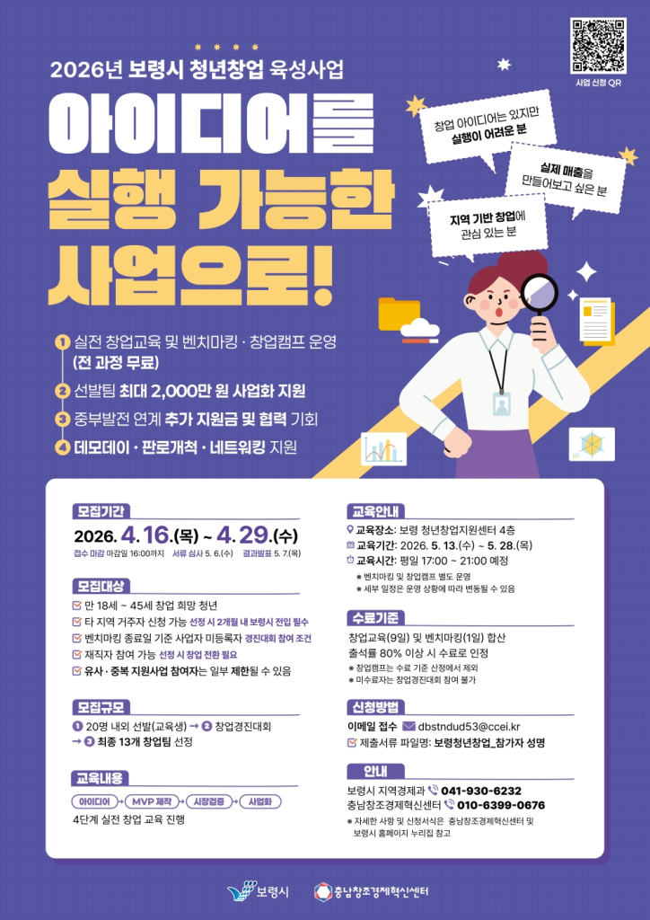 충남창조경제혁신센터가 보령시와 함께 ‘2026년 보령시 청년창업 육성사업’ 참여자를 모집한다. 이번 사업은 창업을 준비하는 청년을 대상으로 기초교육부터 심화과정, 벤치마킹, 창업캠프, 경진대회, 사업화 지원까지 이어지는 단계별 프로그램으로 구성됐다. 모집 인원은 약 20명이며, 교육 수료자를 대상으로 창업경진대회를 열어 최종 13개 팀을 선발한다. 선정 팀에는 최대 2천만 원의 사업화 자금이 차등 지원되며, 판로개척, 네트워킹, 데모데이 등 후속 프로그램도 제공된다. 특히 한국중부발전과 연계한 데모데이를 통해 우수팀은 추가 지원과 협력 기회를 얻을 수 있다. 지원 대상은 만 18~45세 청년으로 지역 제한 없이 신청할 수 있으나, 최종 선정 시 보령시 주소지 이전과 사업자등록이 필요하다. 접수는 4월 29일 16시까지 이메일로 진행되며, 교육은 5월 중순부터 보령시 청년창업지원센터에서 운영된다. 자세한 내용은 보령시와 충남혁신센터 누리집에서 확인할 수 있다.