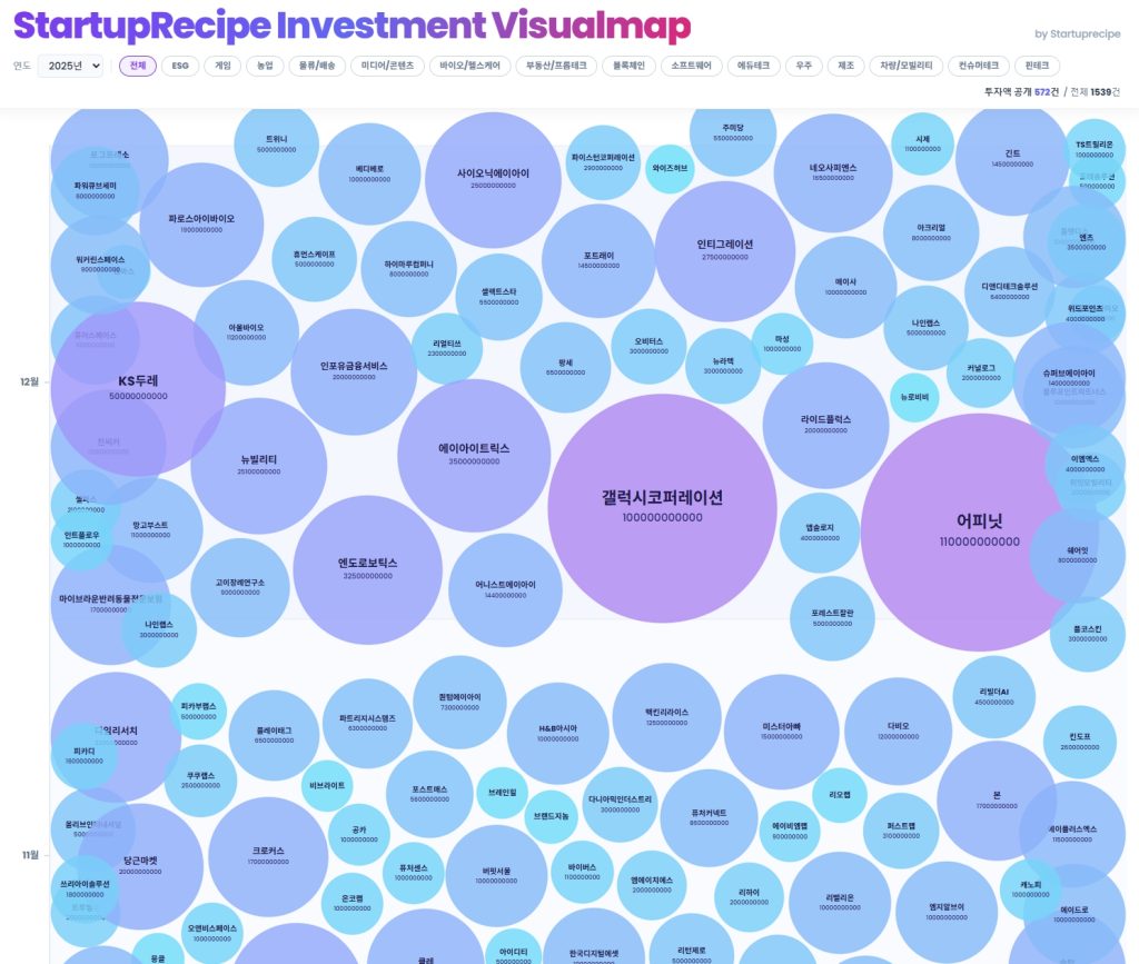 투자 버블맵은 스타트업레시피가 일주월 단위로 제공 중인 국내 스타트업 투자 데이터를 버블 차트로 시각화한 인터랙티브 현황 지도다.
