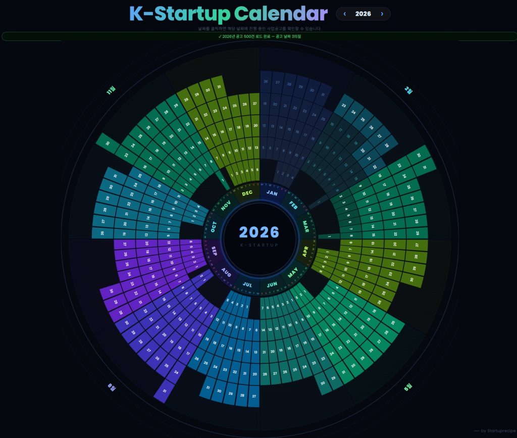 K-스타트업 캘린더는 국내 대표 창업 플랫폼인 K-스타트업 데이터를 활용해 국내에서 한 해 동안 쏟아져 나오는 창업 관련 공고 500건 이상을 1페이지짜리 원형 캘린더로 한 눈에 확인할 수 있도록 한 서비스다.