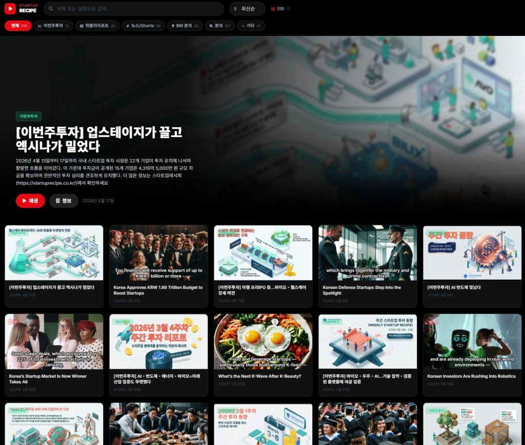비디오플릭스는 스타트업레시피 유튜브 채널을 통해 매주 공개되고 있는 동영상을 티빙이나 넷플릭스 같은 OTT 서비스 형태 UI로 쾌적하게 시청할 수 있게 한 서비스다.