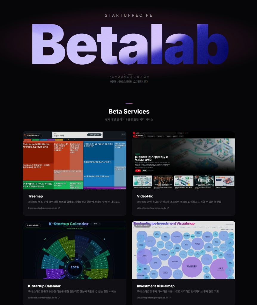 (주)미디어레시피가 운영 중인 스타트업 전문 미디어 스타트업레시피가 베타랩(https://betalab.startuprecipe.co.kr/) 서비스를 공개했다.