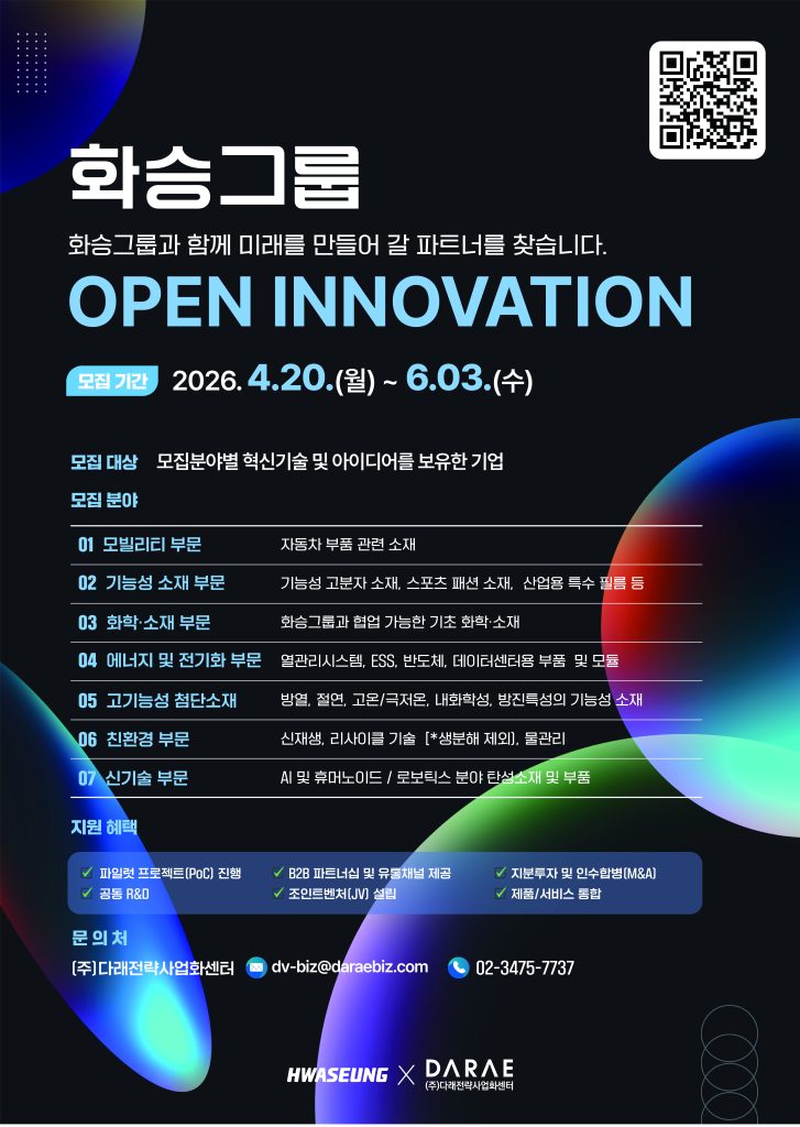 화승그룹이 다래전략사업화센터와 협력하여 ‘2026 오픈이노베이션’에 참여할 기업을 모집한다. 이 개방형 혁신 프로그램은 화승그룹의 인프라와 외부 기술을 연계해 실질적인 사업 협력과 성과 창출을 목표로 한다. 주요 협업 방식은 기술 검증(PoC)과 공동 연구개발(R&D)이다. 모집 분야는 모빌리티, 화학 소재, 에너지, 친환경 기술, AI·로보틱스 등 기존 및 신사업 전반이다. 혁신 기술을 보유한 기업은 4월 20일부터 6월 3일까지 신청 가능하며, 최종 선발 기업에는 PoC 및 R&D 기회와 함께 투자, M&A 등 다양한 후속 사업화 기회가 제공될 예정이다.