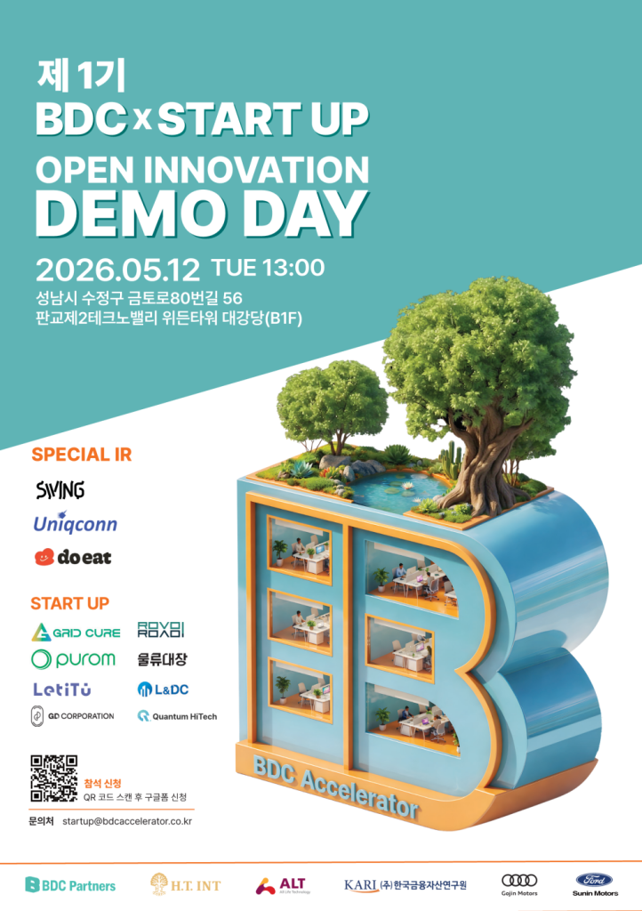 비디씨엑셀러레이터가 첫 번째 보육 프로그램의 성과를 공개하는 ‘BDC X START UP OPEN INNOVATION 데모데이’를 5월 12일 성남 판교 제2테크노밸리 위든타워에서 연다. 이번 행사는 참여 스타트업의 사업 성과를 공유하고 투자·협력 기회를 모색하는 자리로, 성과보고와 3부 구성의 IR 피칭으로 진행된다. 유니컨·더스윙·두잇 등 비디씨의 대표 포트폴리오사가 오프닝 IR을 맡아 성장 전략을 소개하며, 본 프로그램 선정 기업 7곳과 투자 기업 1곳 등 총 8개사가 기술 기반 사업 모델을 발표한다. 후원사와 다수의 AC·VC가 참여해 후속 투자 논의가 이뤄질 전망이다. 행사 장소인 위든타워는 스타트업과 기업·기관이 함께 입주한 공간으로, 오픈이노베이션 협력이 활발한 점이 특징이다. 비디씨엑셀러레이터는 이번 데모데이를 통해 제2판교 중심의 창업 생태계 확장을 목표로 하고 있으며, 참가자는 사전 신청을 통해 누구나 참여할 수 있다.