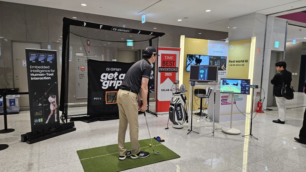전시장 외부에 자리한 리얼월드AI 존에는 에스지랩이 골프 스윙 분석 장비를 설치하고 체험자를 맞았다. 기존 솔루션이 스윙 모션을 캡처하는 것과 달리 에스지랩은 골프채 그립에 탑재하는 센서로 데이터를 수집하는 제품을 선보였다. 에스지랩은 향후 골프 퍼포먼스 시장을 넘어 산업현장에서 인간·도구 상호작용 센서 AI 플랫폼으로 확장한다는 계획이다.