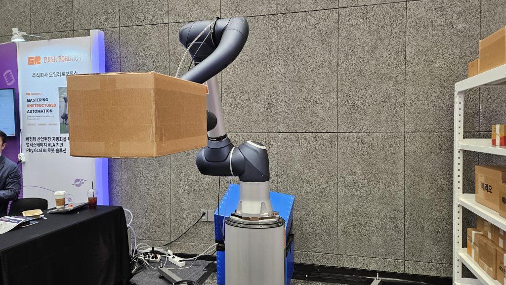 피지컬AI 존에는 요즘 ‘핫한’ 로봇이 자리했다. 오일러로보틱스는 음성으로 명령을 내리면 움직이는 로봇 솔루션을 선보였다. 비정형 산업현장 자동화를 위한 멀티스테이지 VLA 기반 피지컬AI 로봇 기업으로 이날 음성으로 물류 박스를 옮기는 시연을 시범적으로 진행했다.