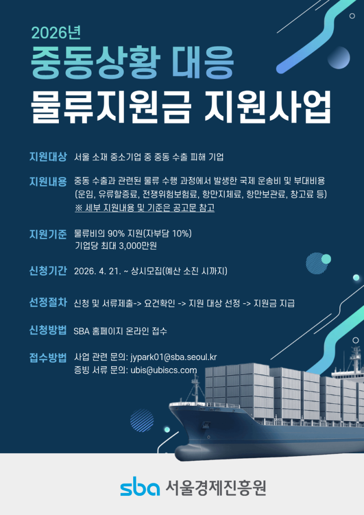 서울경제진흥원이 중동 지역 불안정으로 물류 차질을 겪는 서울 소재 수출기업을 대상으로 최대 3천만 원의 물류비를 지원하는 긴급 사업을 시작했다. 해상 운임 급등과 항로 변경, 선적 지연 등이 장기화되면서 일부 기업이 수출을 중단하거나 물량을 줄이는 상황이 이어지자, 시급한 비용 부담을 덜기 위한 조치다. 지원은 기업이 먼저 지출한 물류비를 사후 정산하는 방식으로 이뤄지며, 신청 후 3영업일 내 선정 결과가 통보되고 선정 기업은 14일 안에 지원금을 받을 수 있다. 물류비는 최대 90%까지 보전되며, 중동 정세로 인해 실제로 물류 차질이 발생한 건만 지원 대상이 된다. 반복적 차질에 대응할 수 있도록 동일 기업의 복수 신청도 허용했다. 신청은 SBA 홈페이지에서 가능하며, 진흥원은 이번 조치를 통해 수출 중단 위기에 놓인 기업들의 부담을 완화하고 지속적인 해외 진출을 뒷받침한다는 방침이다.