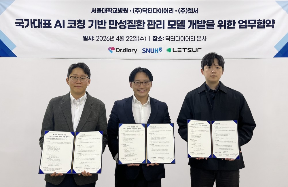 만성질환 관리 플랫폼 닥터다이어리는 서울대학교병원 최형진 교수 연구팀, AI 전문기업 렛서와 국가대표 만성질환 관리 분야의 AI 코칭 모델 공동 개발을 위한 업무협약(MOU)을 22일 체결했다. 이번 협약은 세 기관의 전문성을 통합하여 병원 밖 일상에서 실질적으로 작동하는 개인 맞춤형 AI 코칭 모델을 구현하는 것을 목표로 한다. 첫 번째 과제로 보건복지부 AX-Sprint 사업의 ‘만성질환 관리 AI 코칭’ 분야 참여를 추진하며, 닥터다이어리의 원천 AI 기술, 서울대병원의 임상 데이터 검증 및 지침 반영, 렛서의 LLM 고도화 역량을 기반으로 통합 관리 모델을 구축할 방침이다.