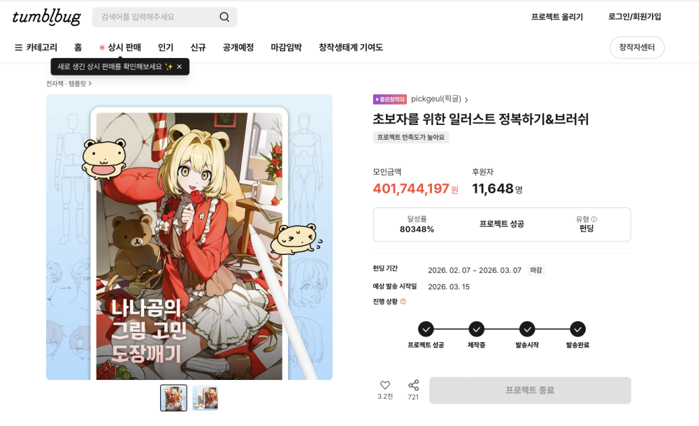 창작 교육 콘텐츠 브랜드 픽글(pickgeul)이 일러스트레이터 나나곰과 협업한 드로잉 교육 프로젝트로 텀블벅 펀딩액 4억 원을 달성하며 기존 목표의 80348%를 초과 달성했다. 1만 1천 명 이상의 후원자를 기록한 이번 프로젝트의 성공은 일러스트가 전문가의 영역을 넘어 10대와 20대를 중심으로 자신의 취향을 직접 만들고 SNS에 공유하는 주체적인 창작 활동으로 확대되고 있음을 보여준다. 픽글은 앞으로도 누구나 쉽게 창작할 수 있도록 진입 장벽을 낮추는 새로운 콘텐츠를 활발히 구축할 계획이다.