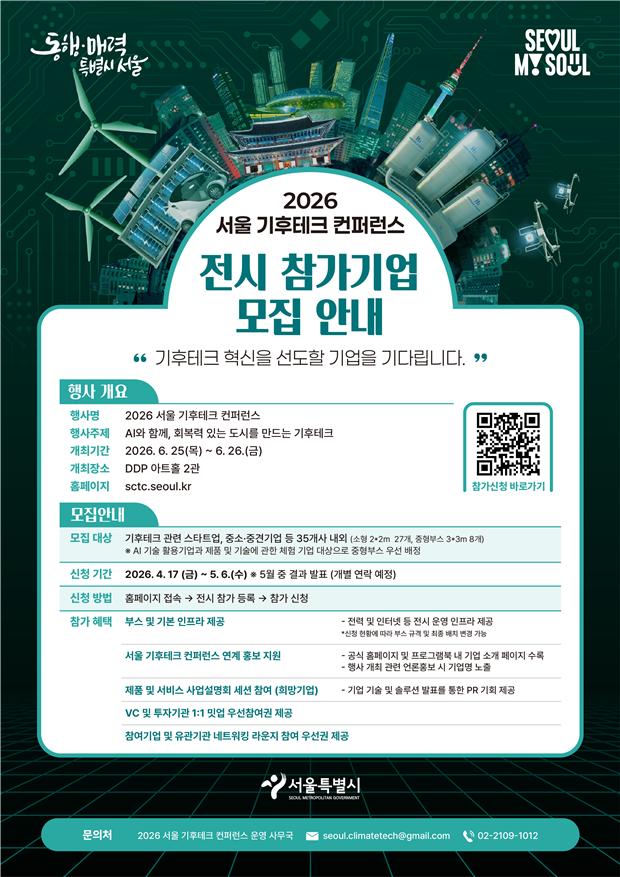 서울시가 ‘2026 기후테크 컨퍼런스’ 전시에 참여할 기업을 4월 17일부터 5월 6일까지 모집한다. 이번 행사는 ‘AI와 함께 만드는 회복력 있는 도시’를 주제로 6월 25~26일 DDP 아트홀에서 열리며, 국내외 전문가 강연, 기술 전시, 기업·투자사 간 상담 프로그램으로 구성된다. 모집 대상은 기후테크 기술을 보유한 스타트업과 중소·중견기업으로 약 35개사를 선정할 계획이다. 특히 AI 기반 온실가스 감축 기술이나 시민 체험 요소가 풍부한 기업이 우대된다. 선정 기업에는 전시 공간 제공, 기술 홍보, 제품·서비스 발표 기회, 투자사와의 1:1 상담 등 실질적 지원이 제공된다. 행사 기간에는 기관 간 교류를 위한 네트워킹 라운지도 운영된다. 시는 이번 행사가 시민에게는 AI·기후테크 체험의 장이 되고, 기업에는 홍보와 투자 연계 기회를 제공하며, 정책·연구기관에는 기후 대응 전략을 논의하는 계기가 될 것으로 기대하고 있다. 신청은 공식 누리집에서 가능하며, 최종 결과는 5월 중 개별 통보된다.