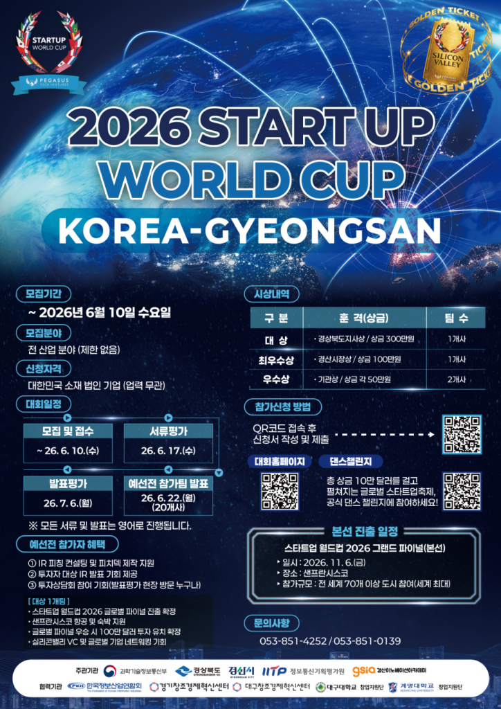 글로벌 액셀러레이터 젠엑시스가 국내 유망 기업의 글로벌 시장 진출을 돕기 위한 ‘2026 스타트업 월드컵 코리아-경산’ 참가기업 모집에 나섰다. 세계 최대 규모의 스타트업 경진대회인 ‘스타트업 월드컵’의 한국 대표 선발전인 이 대회는 유망 스타트업 발굴부터 해외 진출, 투자 연계까지 전 과정을 직접 운영하며 전주기 지원을 제공하는 것이 특징이다. 업력과 산업 분야에 관계없이 대한민국 소재 법인은 6월 10일까지 지원할 수 있다. 최종 우승 기업은 11월 미국 샌프란시스코에서 열리는 그랜드 파이널 진출권을 획득하며, 글로벌 본선 우승 시 최대 100만 달러(약 15억 원) 투자 유치 기회를 얻는다. 본선 행사 당일에는 벤처캐피탈과의 1:1 투자 상담 및 네트워킹 프로그램도 운영될 예정이다.