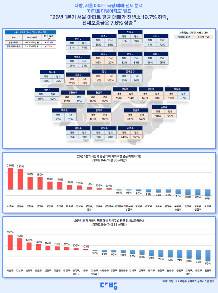 국내 부동산 플랫폼 다방이 2026년 1분기 서울 아파트 시세를 분석한 ‘아파트 다방여지도’를 공개했다. 전용면적 84㎡ 기준 평균 매매가는 11억 9476만 원으로 전년 대비 19.7% 하락했으며, 평균 전세 보증금은 7억 1068만 원으로 7.6% 상승했다. 서초구는 매매가와 전세 보증금 모두 서울 평균을 크게 웃돌며 최고 수준을 기록했다. 매매가는 28억 6190만 원으로 평균의 240%에 달했고, 전세 보증금도 10억 9906만 원으로 4분기 연속 1위를 차지했다. 강남·송파·용산 등 주요 지역 역시 평균을 상회했다. 특히 광진구는 매매가 상승률이 가장 높았고, 강동구는 전세 보증금 상승률이 19.8%로 가장 두드러졌다. 서울 25개 자치구 중 24곳에서 전세 보증금이 오른 점은 시장 전반의 변화를 보여준다. 다방은 앞으로도 분기별로 아파트 여지도를 공개해 지역별 시세 흐름을 한눈에 확인할 수 있도록 제공할 예정이다.