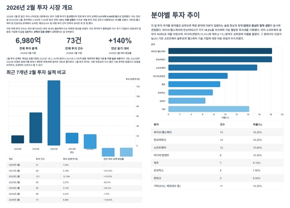 올해 2월 투자금액은 역대급 호황기 시절 2022년 1조원대를 제외하면 최근 7년 중 가장 높은 수준으로 2026년 투자 환경이 완연한 회복세에 접어든 것으로 풀이된다.