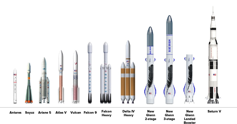 뉴글렌은 길이는 80∼95m 사이, 직경은 7m, 무게도 45톤에 달한다. 아폴로계획에 쓰였던 새턴V 로켓과 거의 같은 규모를 자랑한다. 스페이스엑스의 팔콘헤비(Falcon Heavy)보다 큰 건 물론. BE-4 엔진 7개를 탑재한다.